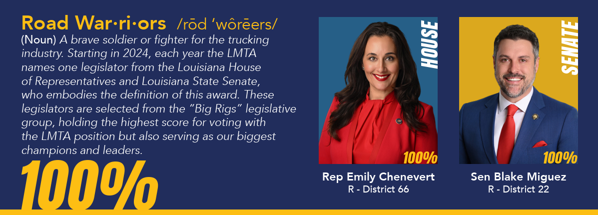Each year, LMTA honors two standout legislators--one from the Louisiana House and one from the Senate--who go above and beyond in their support of the trucking industry. Our 2025 Road Warriors are Rep. Emily Chenevert (District 66) and Sen. Blake Miguez (District 22). Both earned a perfect 100% score on our legislative scorecard and have been unwavering advocates for common-sense reform. These leaders not only voted with trucking--they led the charge.