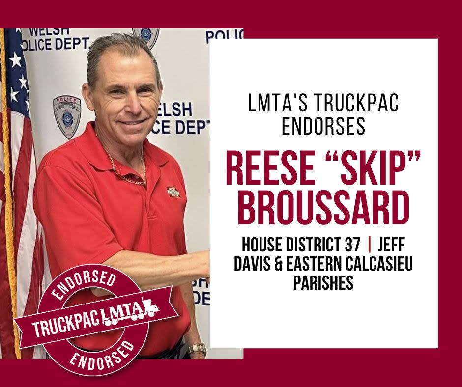 Reese "Skip" Broussard – Louisiana House, District 37 (Jeff Davis & Eastern Calcasieu Parishes) TruckPAC proudly endorses Skip Broussard for State House District 37. He has demonstrated a clear understanding of the challenges facing trucking and small businesses and is committed to being a strong, reliable voice for our industry at the Capitol.
