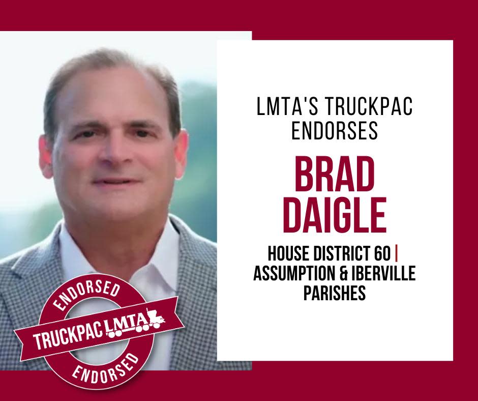 Brad Daigle – Louisiana House, District 60 (Assumption & Iberville Parishes) TruckPAC is also endorsing Brad Daigle, who has shown a willingness to support policies that strengthen Louisiana’s economy and protect the interests of employers and job creators, including the trucking industry.