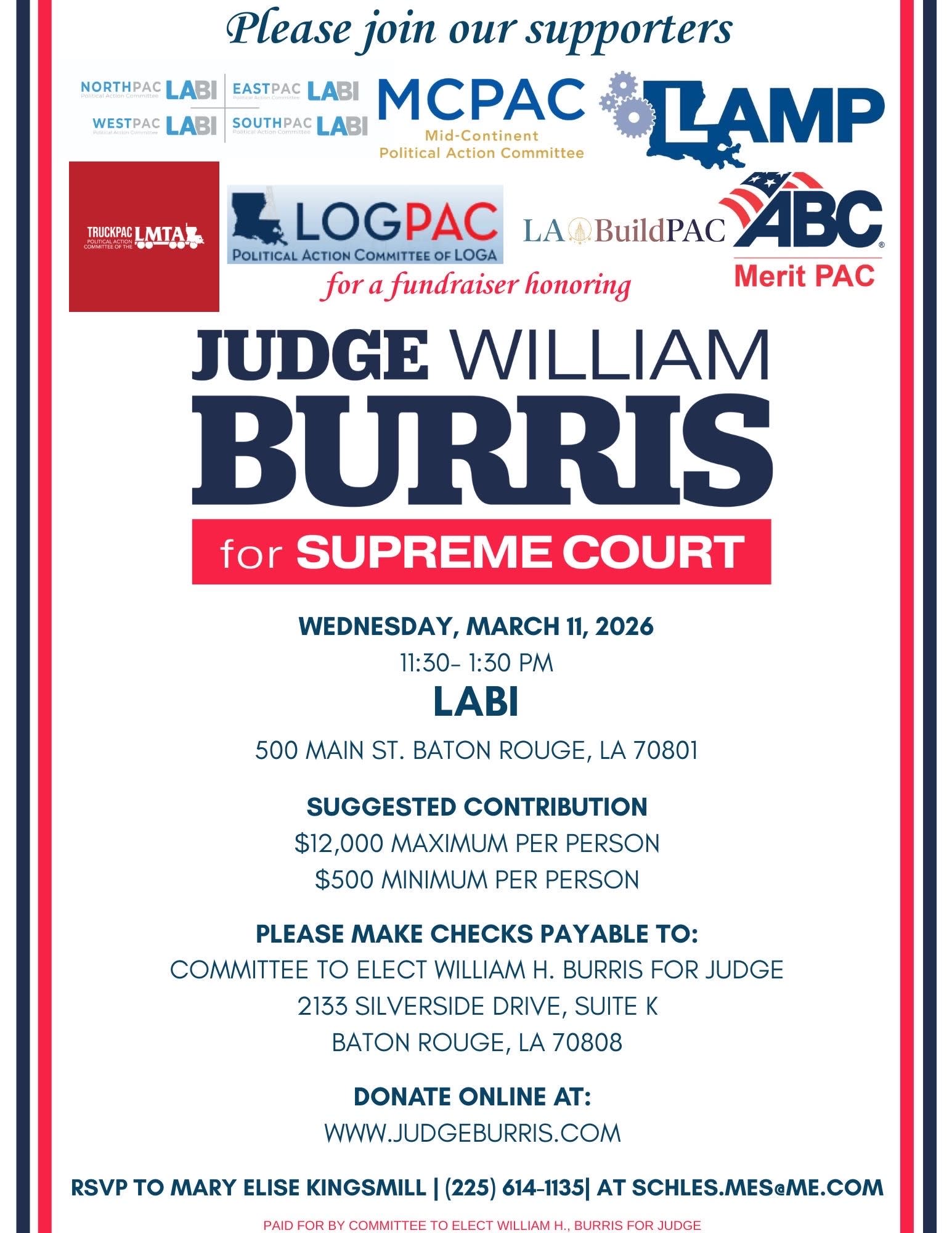 Please join our supporters for a fundraiser honoring Judge William Burris for Louisiana Supreme Court. We hope you will join us in supporting Judge Burris and his campaign.