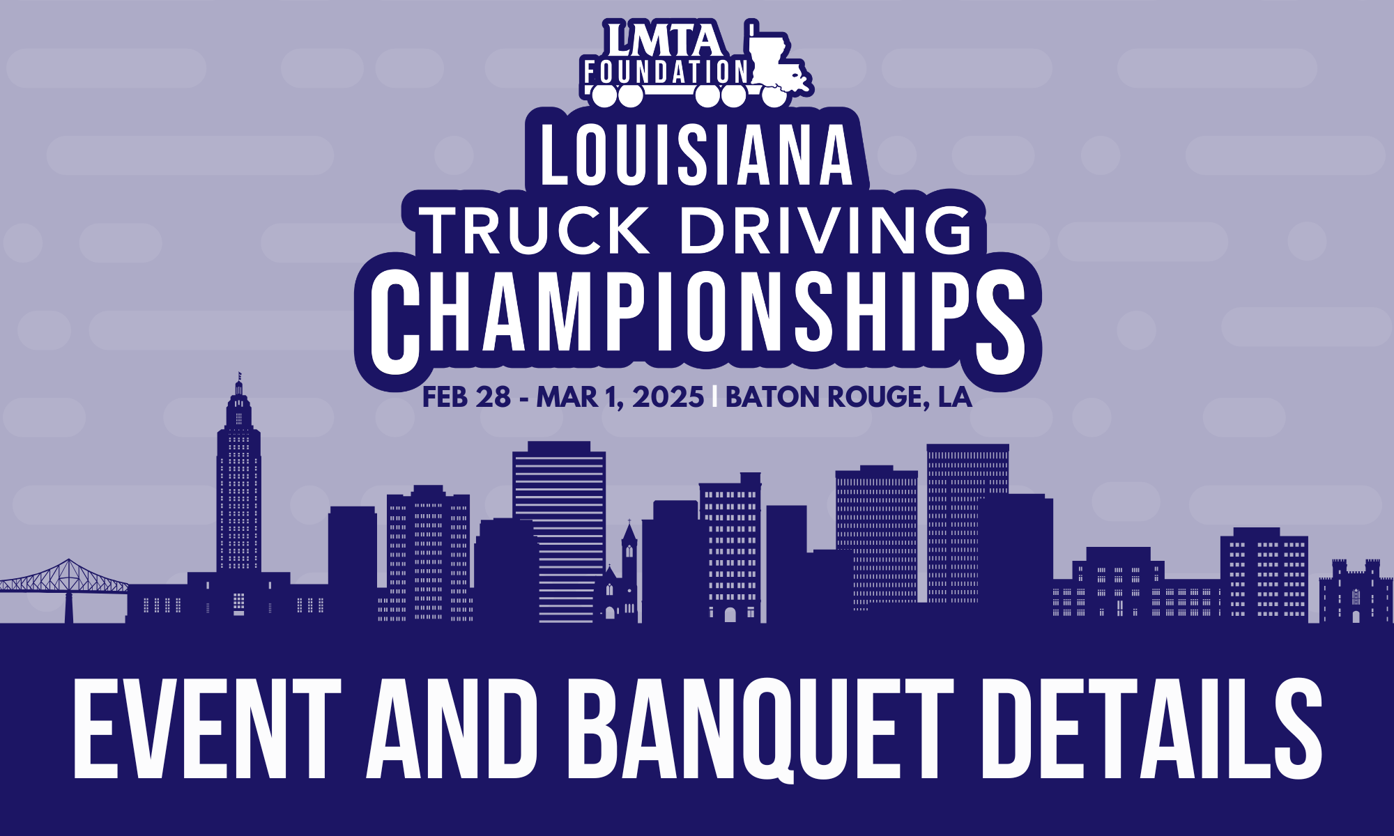 Our 2025 Truck Driving Championships is to be held Feb 28 - Mar 1, 2025. The registration, testing and awards banquet will be held at the L'Auberge Casino & Hotel in Baton Rouge. The Pre-trip inspection and driving course will be hosted at the L’Auberge Casino & Hotel overflow parking lot in Baton Rouge.
