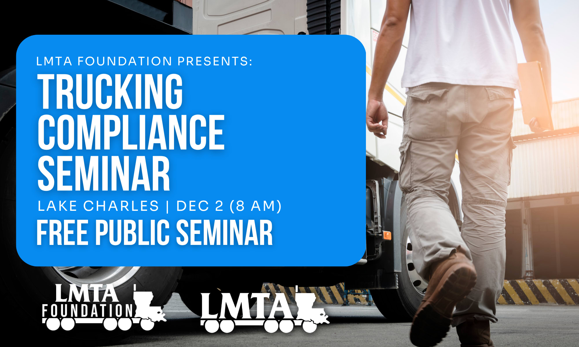 Join the LMTA Foundation for an essential Compliance Seminar in the Lake Charles area, designed to help trucking professionals navigate the complexities of federal and state regulations. This half-day seminar will provide critical insights into compliance requirements, safety best practices, and regulatory updates affecting motor carriers operating in Louisiana.